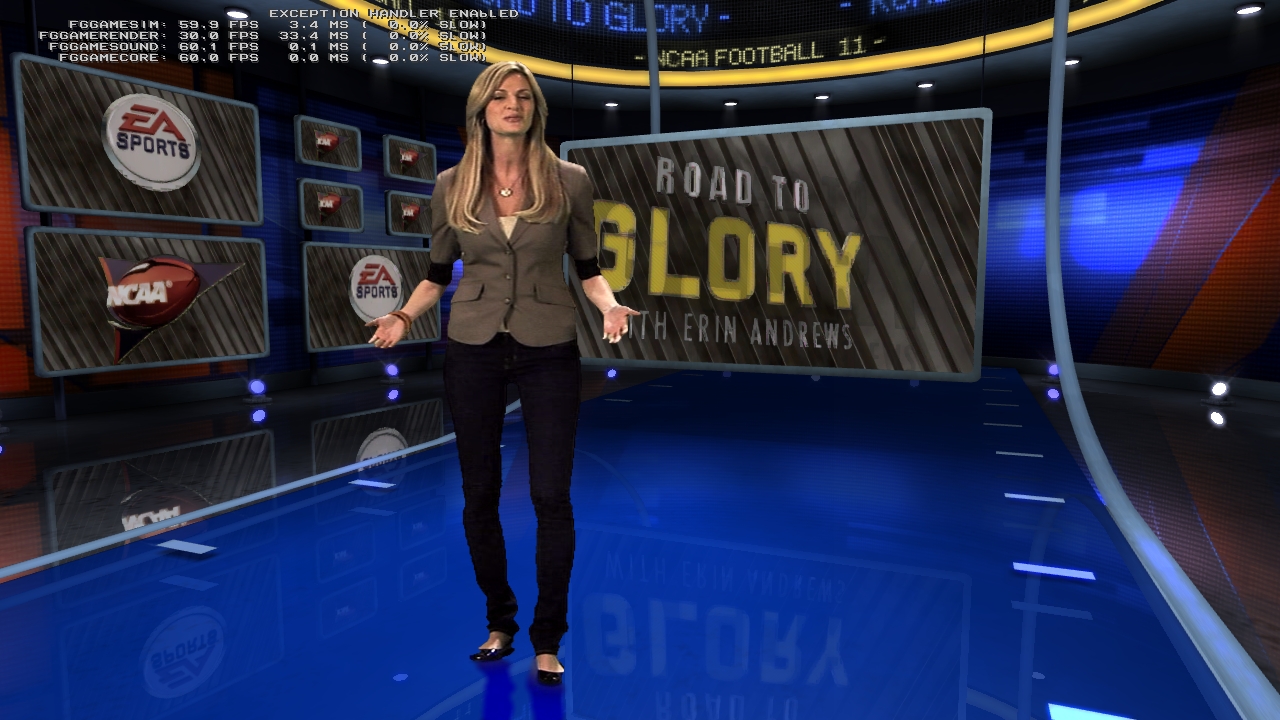 One of big goals for our game was to improve the user experience. To do this, my team devised an idea to seamlessly integrate the user interface directly into the game environment. I was the lead of this project and the architect of the framework. The system used traditional Flash/Action Script to dynamically populate 3D objects used to control game flow. Part of this initiative also included pioneering technology for blending live video footage into our 3d environments. We were lucky to work with ESPN anchor Erin Andrews on this effort.