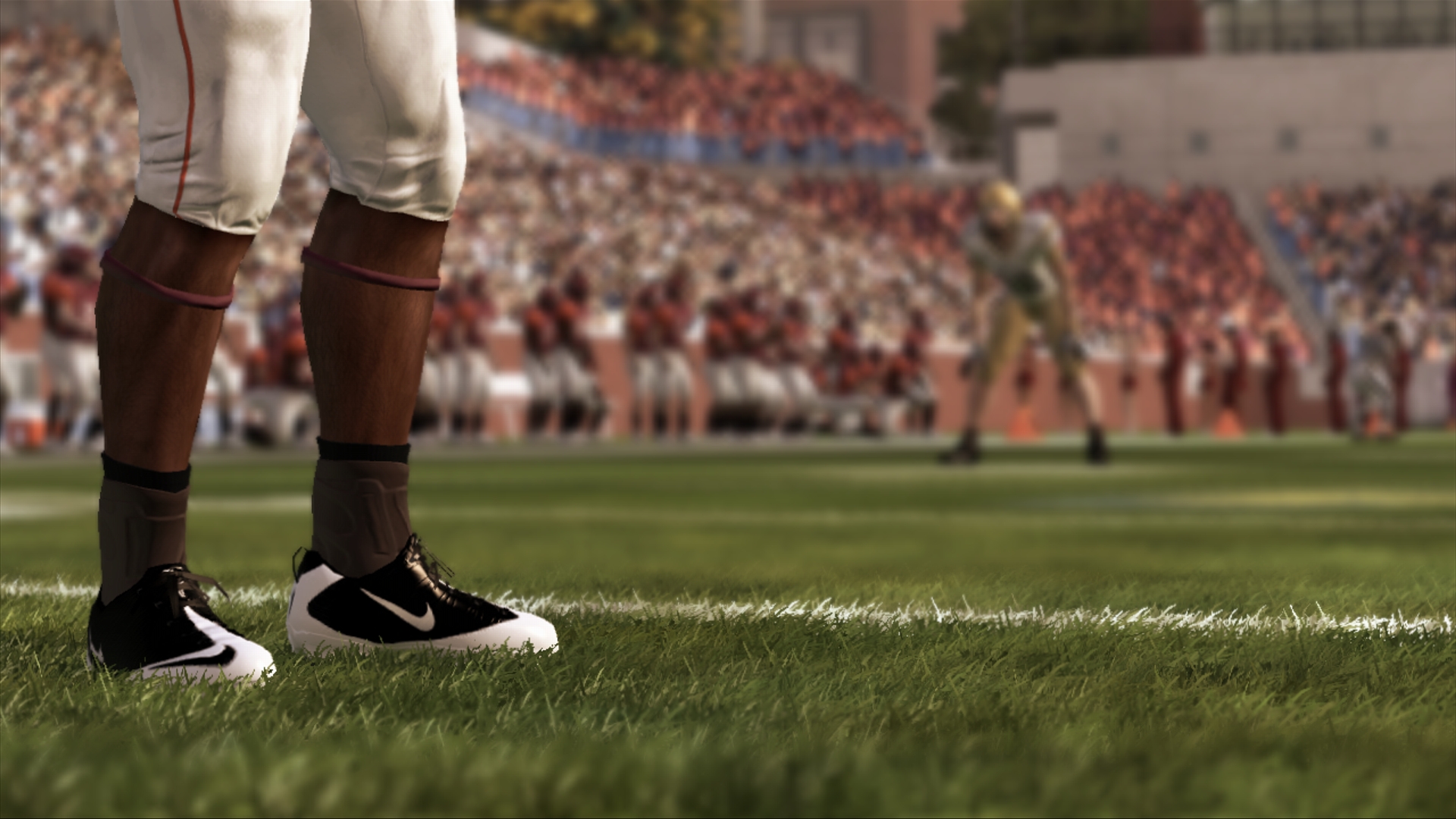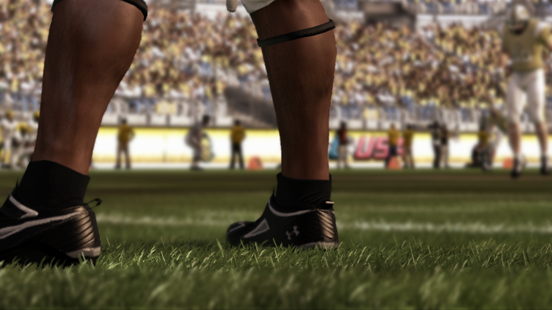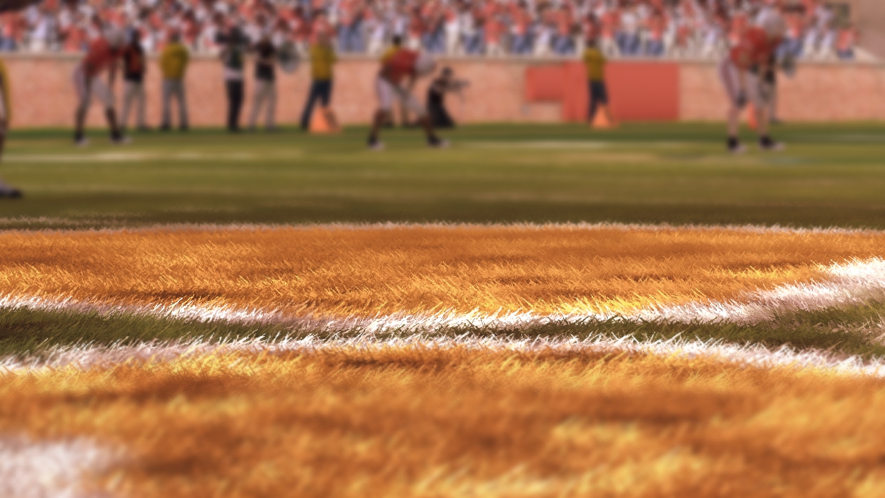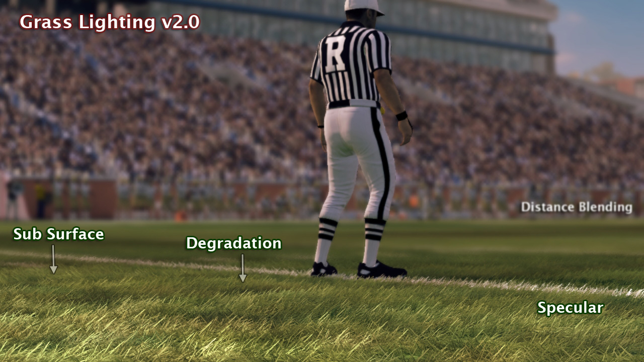 In NCAA 13, our art director wanted to add close up low angle shots to the game. Doing this required creating a system to render photo realistic grass. I developed a procedural algorithm to generate camera-centric grass geometry at runtime. This produced believable occlusions at grazing angles. I also wrote an optimized shader to approximate realistic lighting taking into account blade translucency, bounce lighting, field degradation, paint lines, and weather. The entire system had a rendering budget of only 15ms.