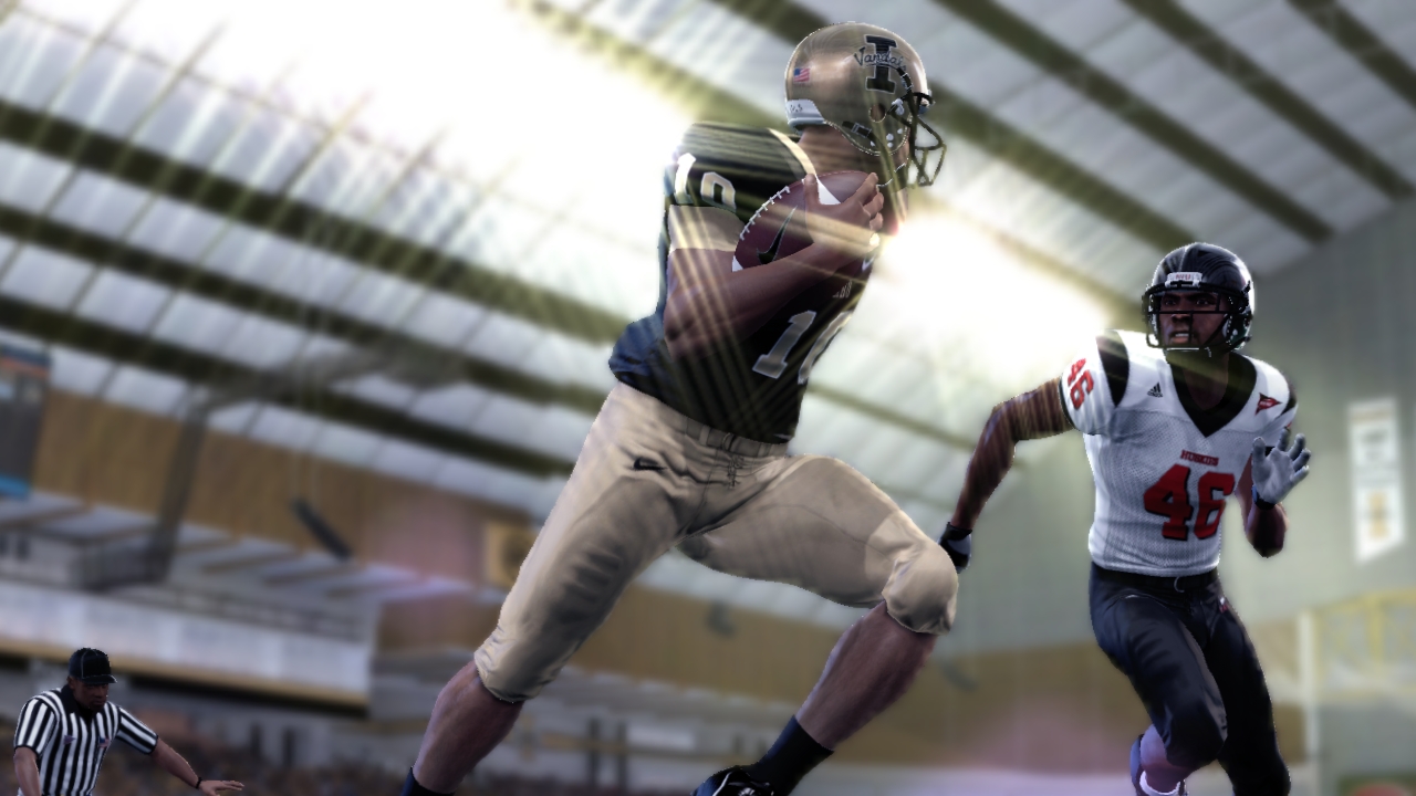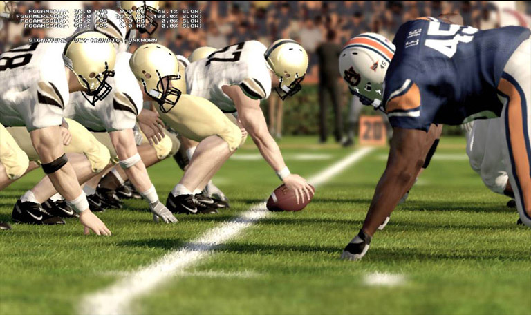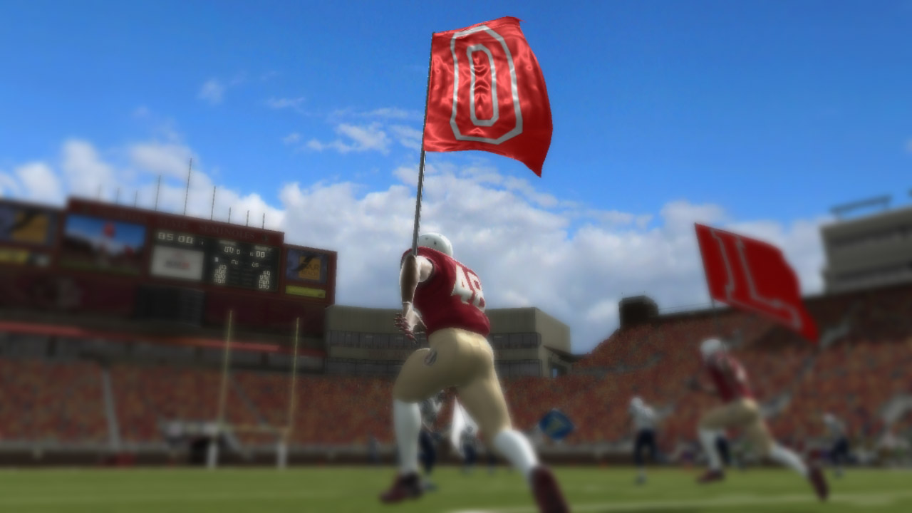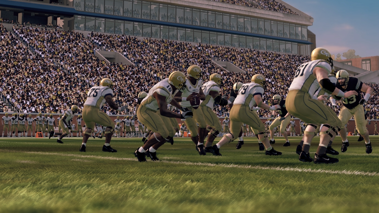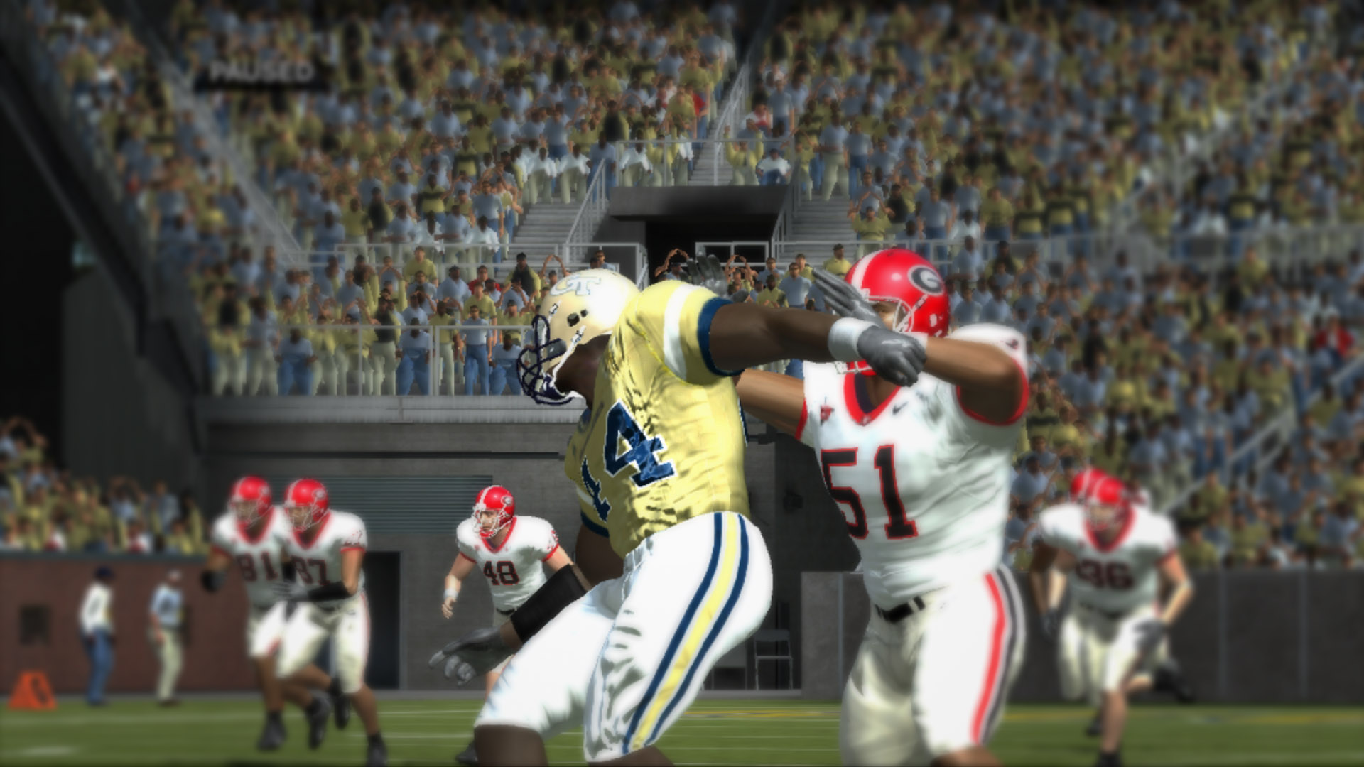 In NCAA 13, our art director wanted to add close up low angle shots to the game. Doing this required creating a system to render photo realistic grass. I developed a procedural algorithm to generate camera-centric grass geometry at runtime. This produced believable occlusions at grazing angles. I also wrote an optimized shader to approximate realistic lighting taking into account blade translucency, bounce lighting, field degradation, paint lines, and weather. The entire system had a rendering budget of only 15ms.
