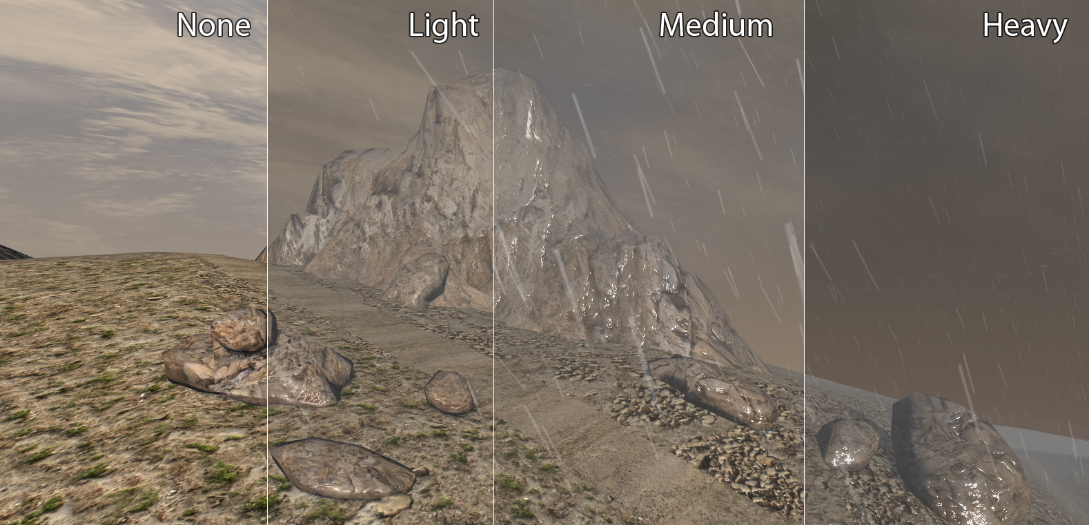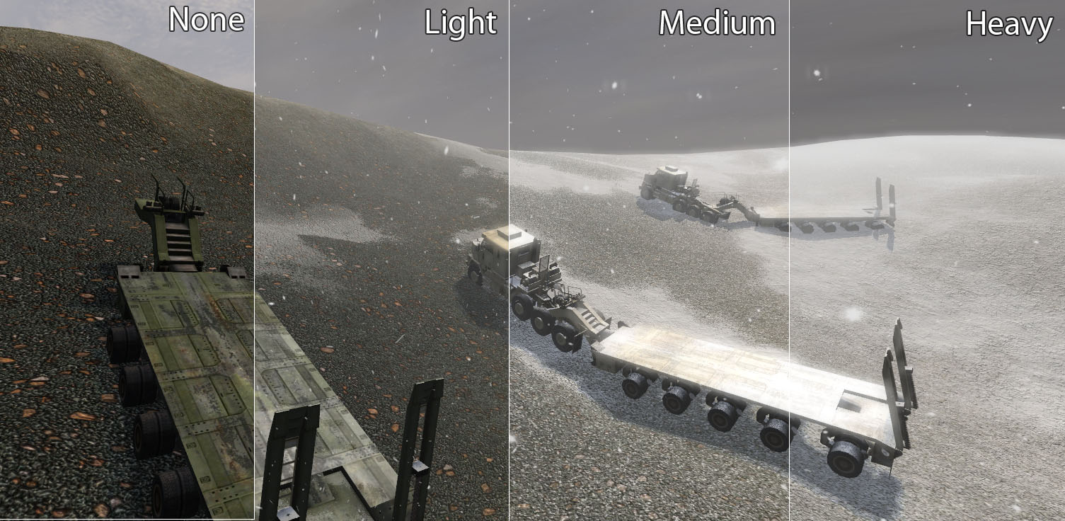 As part of the efforts to enhance realism in our trainers, I developed a system to create dynamic procedural weather. This allowed the content creators the flexibility to easily change the difficulty of any training scenario by tweaking a few parameters. The primary parts of this framework include weather based texture blending, surface material modifications, dynamic skies, and visibility changes. Some additional details I added are terrain physics/wind tweaks and windshield glass effects.
